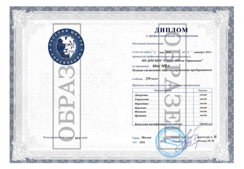 По итогам успешных выпускных испытаний участники получают диплом о профессиональной переподготовке. Диплом будет содержать информацию о том, что вы прошли курс MBA.